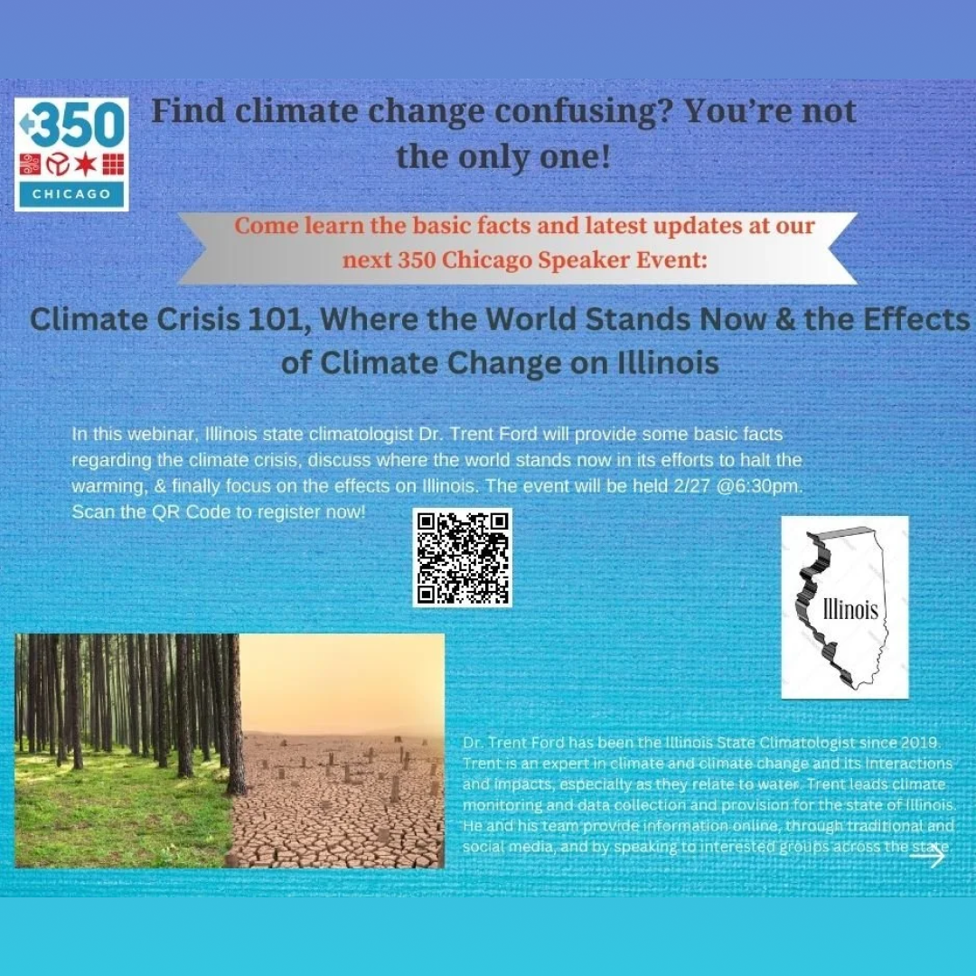 Register now for our next 350 Chicago Monthly Speaker Event featuring Illinois Climatologist Dr. Trent Ford! Please help us spread the word and share this event with anyone who might be interested. You can register with the QR code in the graphic below.