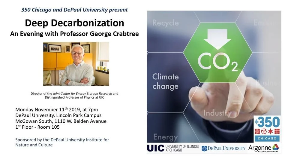Join 350 Chicago and the DePaul University Institute for Nature and Culture for an evening of discussion on Deep Decarbonization with Professor George Crabtree. This is a free event that is open to students and the public; however, RSVPs are greatly appreciated so that we can have an idea of a head count.