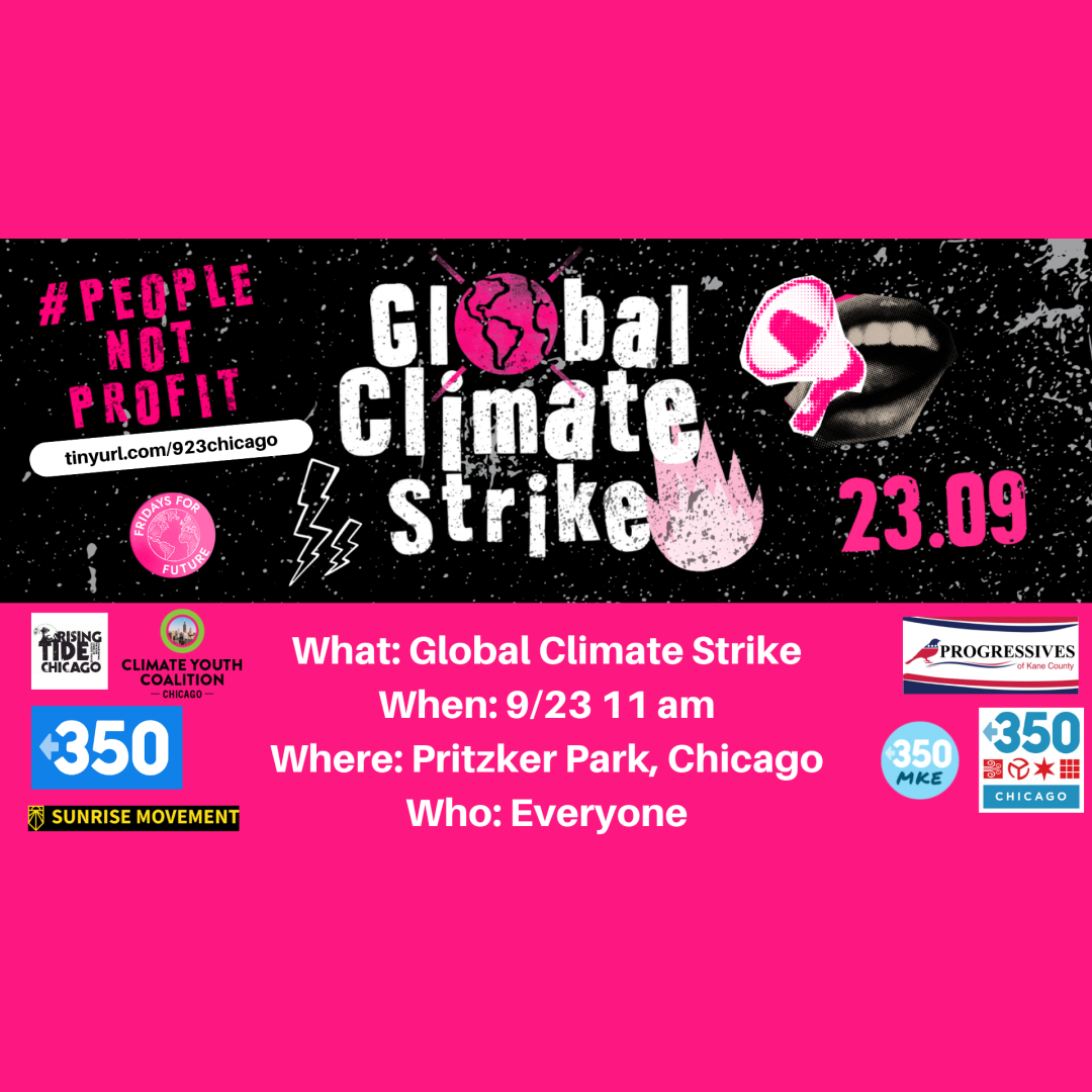On September 23rd, 350 Chicago will be joining the next Fridays for Future Global Climate Strike in Chicago, IL! This joint coalition event is co-hosted by Fridays for Future, Chicago Climate Youth Coalition, Sunrise Movement, 350 Wisconsin, Rising Tide Chicago, Progressives of Kane County, 350.org, and 350 Milwaukee. We’re hoping you can join us!
