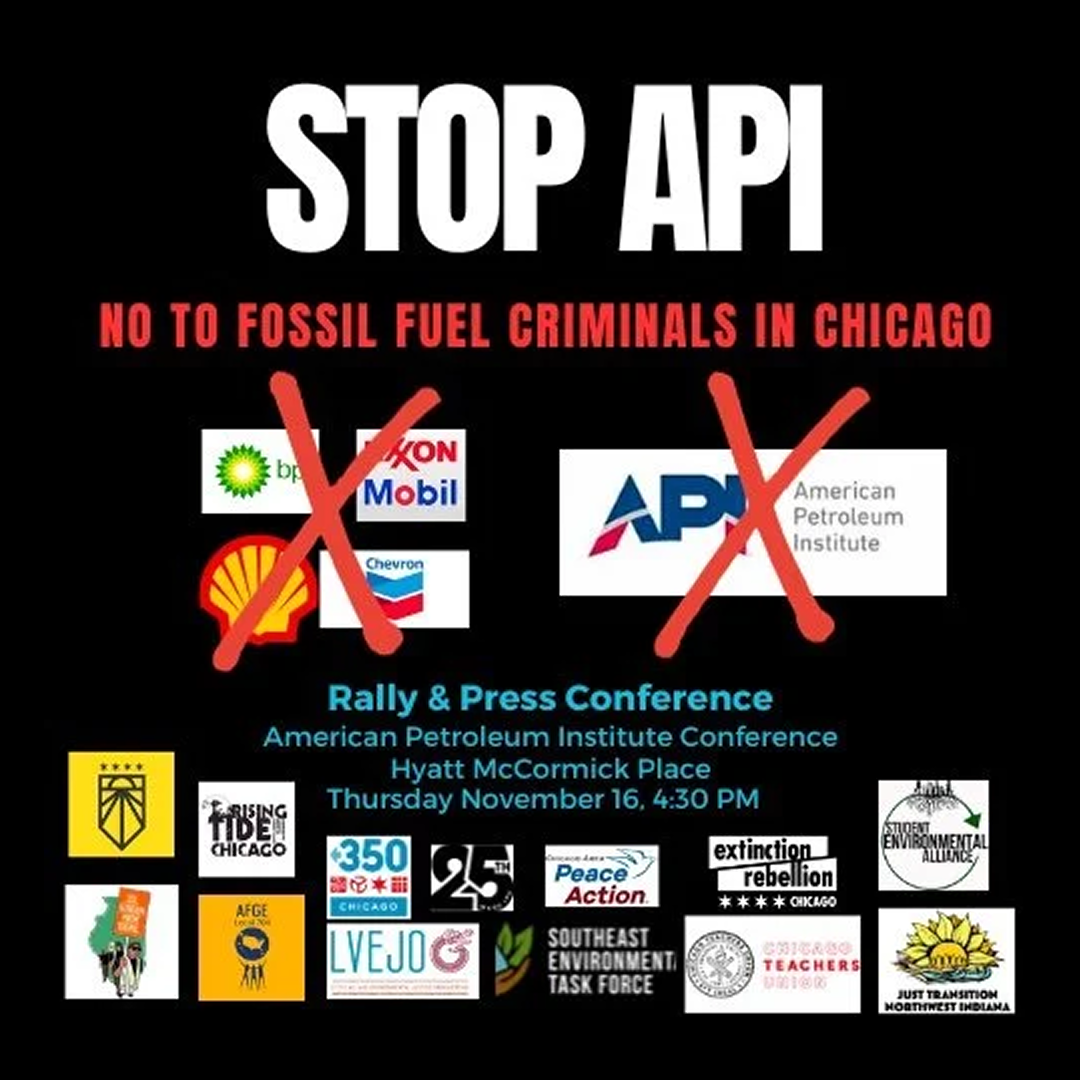 API is a lobbying organization for oil and gas companies such as BP, Shell, Chevron, Exxon Mobil, and many more. The front group plays a crucial role in maintaining profits for and preventing the regulation of the fossil fuel companies most culpable for the global climate crisis. API should not be allowed to host their conference in Chicago unopposed!